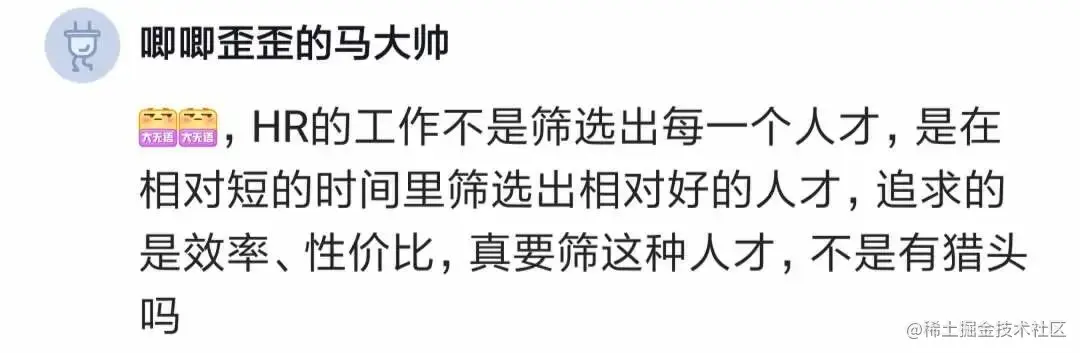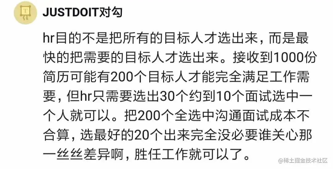 有人说,hr目的不是把所有目标人才选出来,而是最快地把需要的目标人才选出来。追求的是效率和性价比,没人关心人与人之间那一点差异,能胜任工作就可以了。
