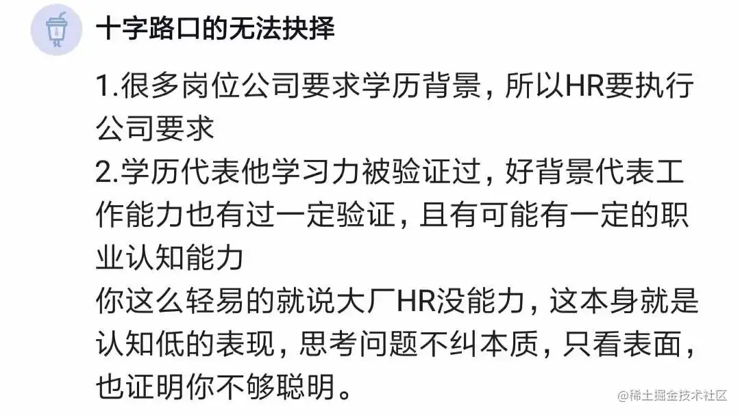有人说,很多公司和岗位要求学历背景,所以hr要执行公司要求。学历代表学习力被验证过,好背景代表工作能力被验证过,可能有一定的职业认知能力。