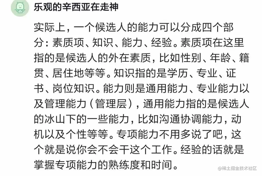 一位网友说,候选人的能力可以分为四个部分:素质,知识,能力,经验。素质指的是候选人的外在素质,比如性别、年龄、籍贯、居住地。知识指的是学历、专业、证书、岗位知识。能力指的是通用能力、专业能力以及管理能力。经验指的是掌握专项能力的熟练度和时间。