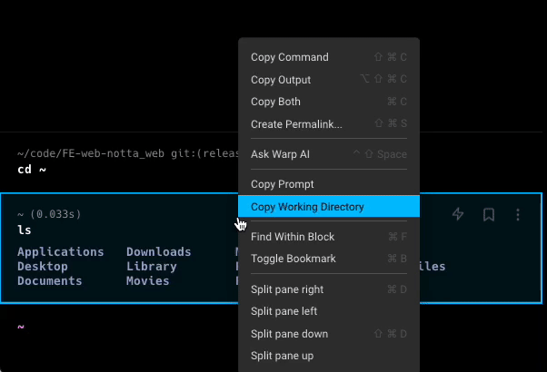- 支持鼠标点击选位,比如我输入 git comit ,我发现少打了 m ,传统终端你只能按3下左方向键到 m 前,现在通过 warp 你只用通过鼠标点击 m 前即可。