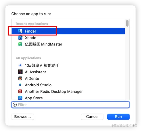 运行和普通应用不同,需要选择一个应用,选择finder即可