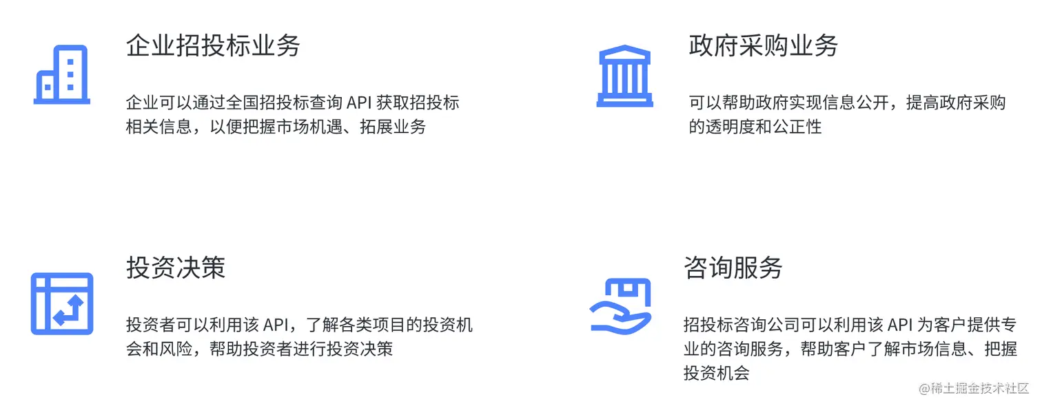 全国招投标查询 API 在政府采购信息监控、企业商业决策等方面都有广泛的应用,带来的商业价值也日益凸显。
