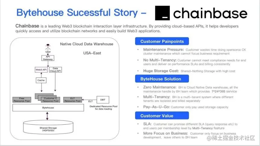 1.ByteHouse 的存储计算分离架构充分满足他们的使用场景(将不同的最终用户/业务分配到各自的计算组),ByteHouse 还可以横向扩展以满足 Chainbase 的并发需求。