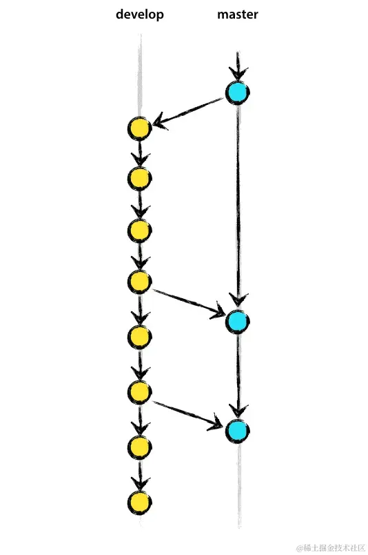 主分支中的代码一般都是可以用于向外界发布的代码,所以开发工作一般不在主分支,一般在开发分支开发,然后经过测试没啥问题之后,再将开发分支的代码合并到主分支上。