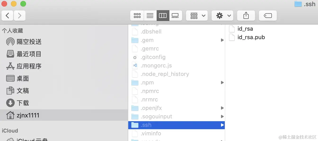 终端执行 ssh-keygen 一路回车,生成秘钥,秘钥存储在用户目录下面,如下: