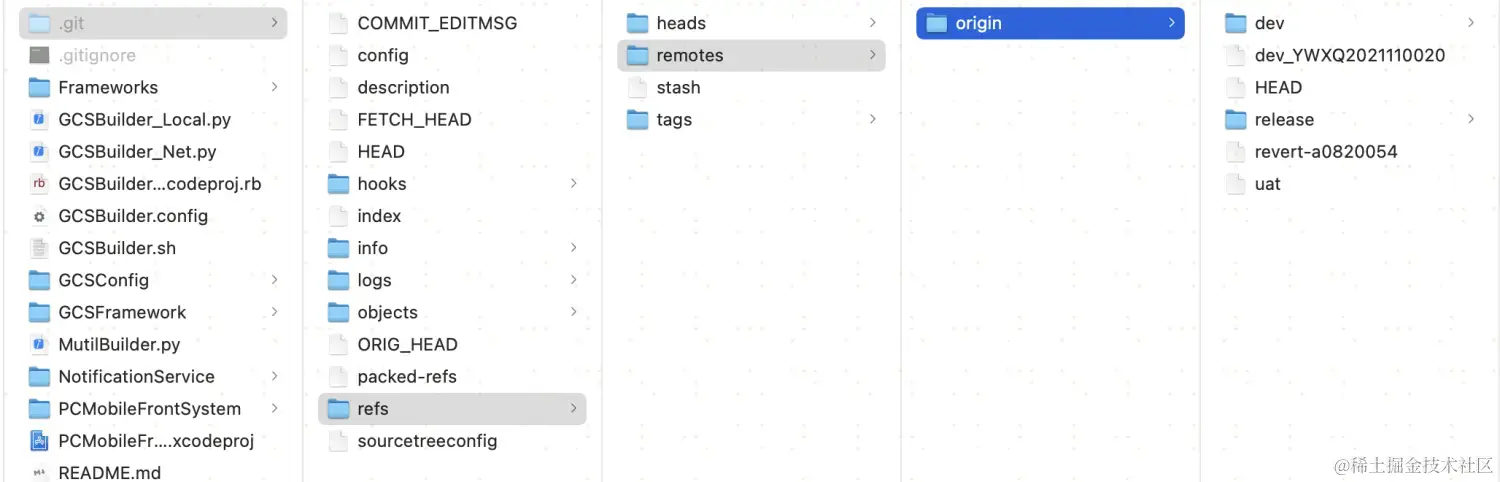 工作区有一个隐藏目录.git,这个不算工作区,而是Git的版本库。.git中的refs/heads是本地分支,或者说本地版本库,.git中的refs/remotes是远程分支,refs/tags是打的标签,stash是暂存的代码,如下: