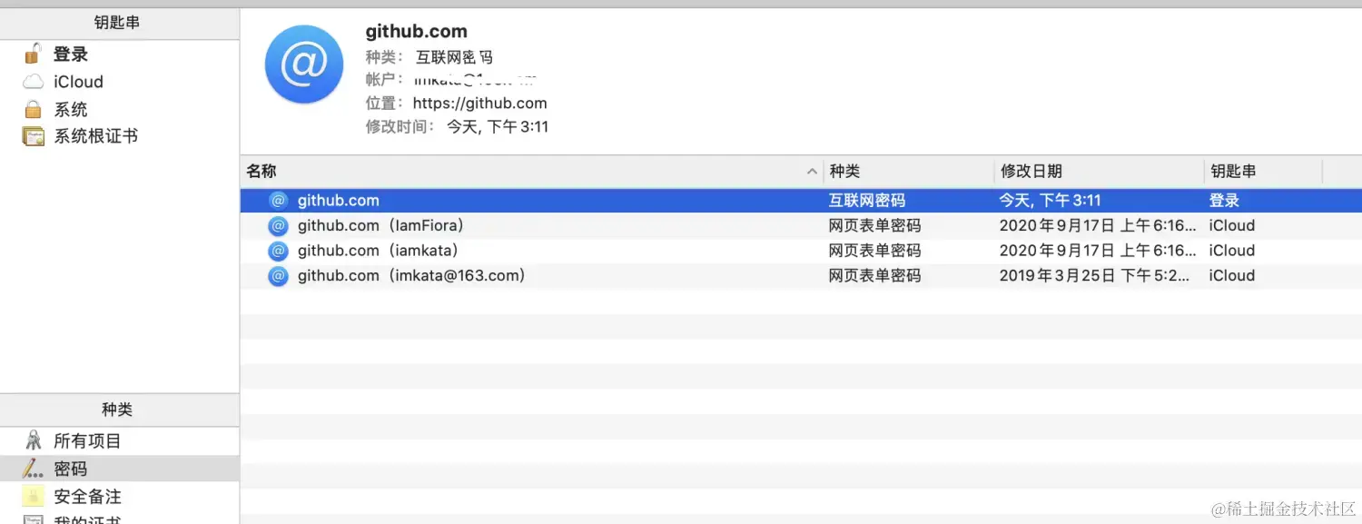 再次执行push命令的时候就不需要输入用户名、密码了,因为电脑自动记住了,如果在钥匙串中将记住的密码删除,下次就还需要输入密码,如下:
