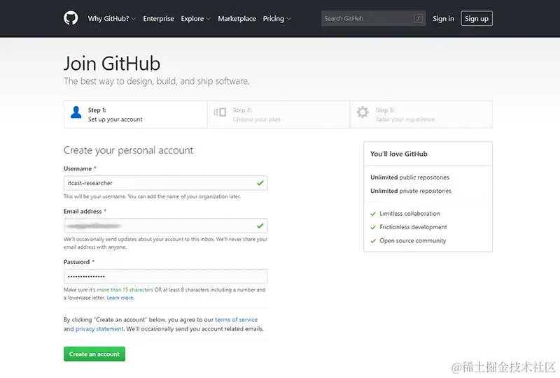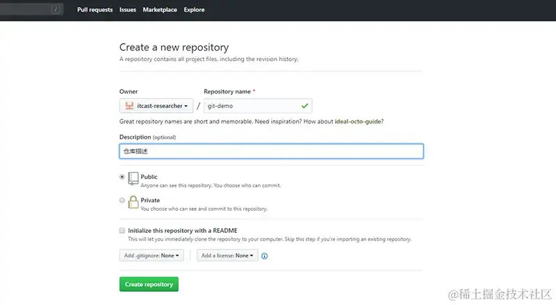 git init,初始化仓库,然后初始化项目,使用add命令添加到暂存区,然后使用commit提交到本地仓库 - 创建远程仓库:填写仓库基本信息