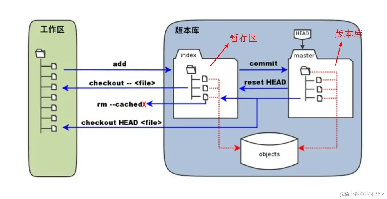 - 图中的 objects 标识的区域为Git的对象库,实际位于 ".git/objects" 目录下。