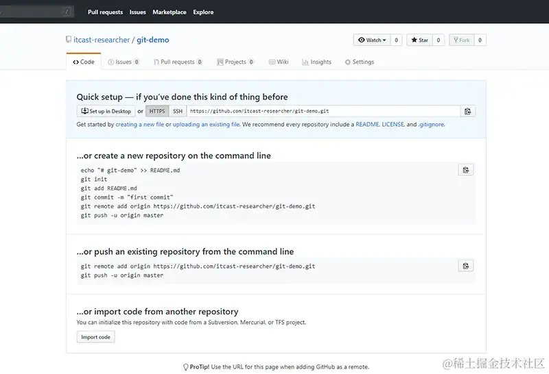很显然我们使用第二种方式,执行命令:git push 远程仓库地址 分支名称,也就是执行git push https://github.com/iamkata/git-demo1.git master,命令的意思就是将本地仓库的当前分支推送到远程仓库的 master 分支。