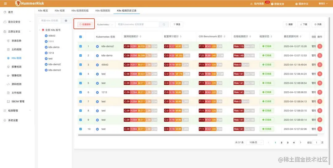 K8s检测规则扩充新增 Rancher 和 KubeSphere类型、增加批量删除、增加阿里云检测类型,并修复了一些V1.0.0中发现的bug。感谢社区小伙伴发现并提交的问题。