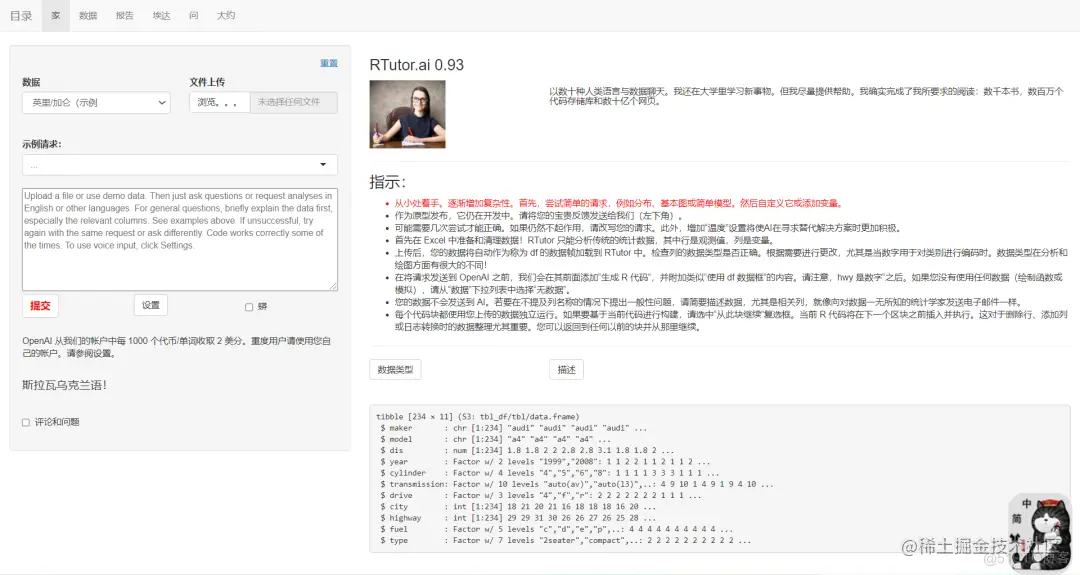 📍基本信息:RTutor 是一款基于 AI 的应用程序,可以快速生成和测试 R 代码。在对 OpenAI 的 Davinci(ChatGPT 的兄弟)的 API 调用的支持下,RTutor 将自然语言翻译成 R 脚本,然后在 Shiny 平台内执行。可以生成 R Markdown 源文件和 HTML 报告。在此处查看 github 存储库:github.com/gexijin/RTu…