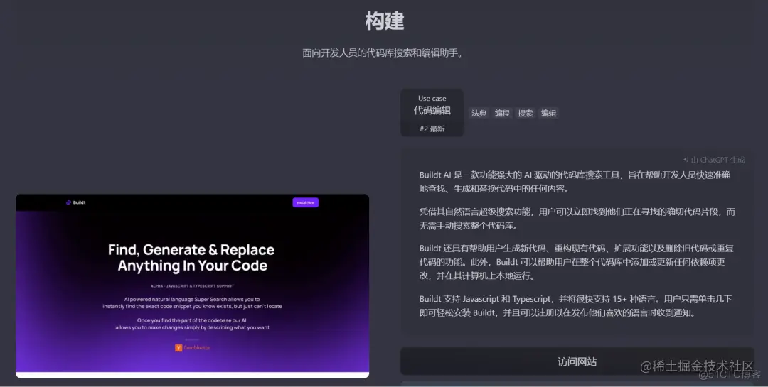📍基本信息:Buildt AI是一种基于人工智能的代码库搜索工具,旨在简化开发人员的代码管理。主要特点和优势包括: