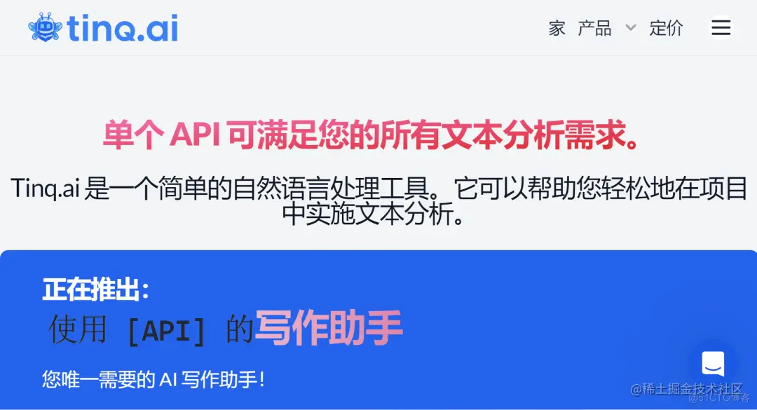 📍基本信息:Tinq.ai 提供一组易于使用和尖端的 NLP API。同时它也是一个简单的自然语言处理工具。它可以帮助您轻松地在项目中实施文本分析。通过该平台,可以将快速而强大的文本生成、重写器/释义器摘要器等功能集成到您的应用程序中。此外,从主题分类到情绪分析和实体提取,它都能满足你的需求。