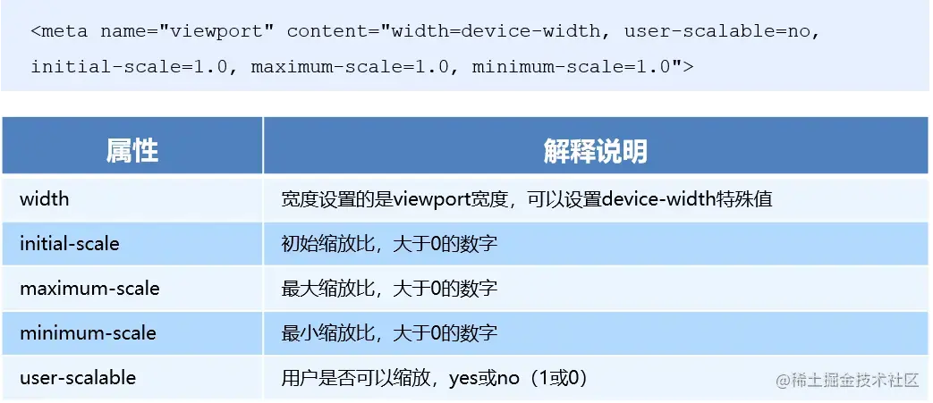 视口宽度和设备保持一致:content="width=device-width 不允许用户自行缩放:user-scalable=no 视口的默认缩放比例1:initial-scale=1 最大允许的缩放比例1:maximum-scale=1 最小允许的缩放比例1:minimum-scale=1
