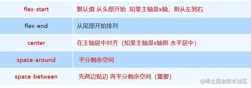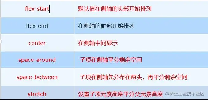 flex-start、flex-end、center、stretch、space-around、space-between