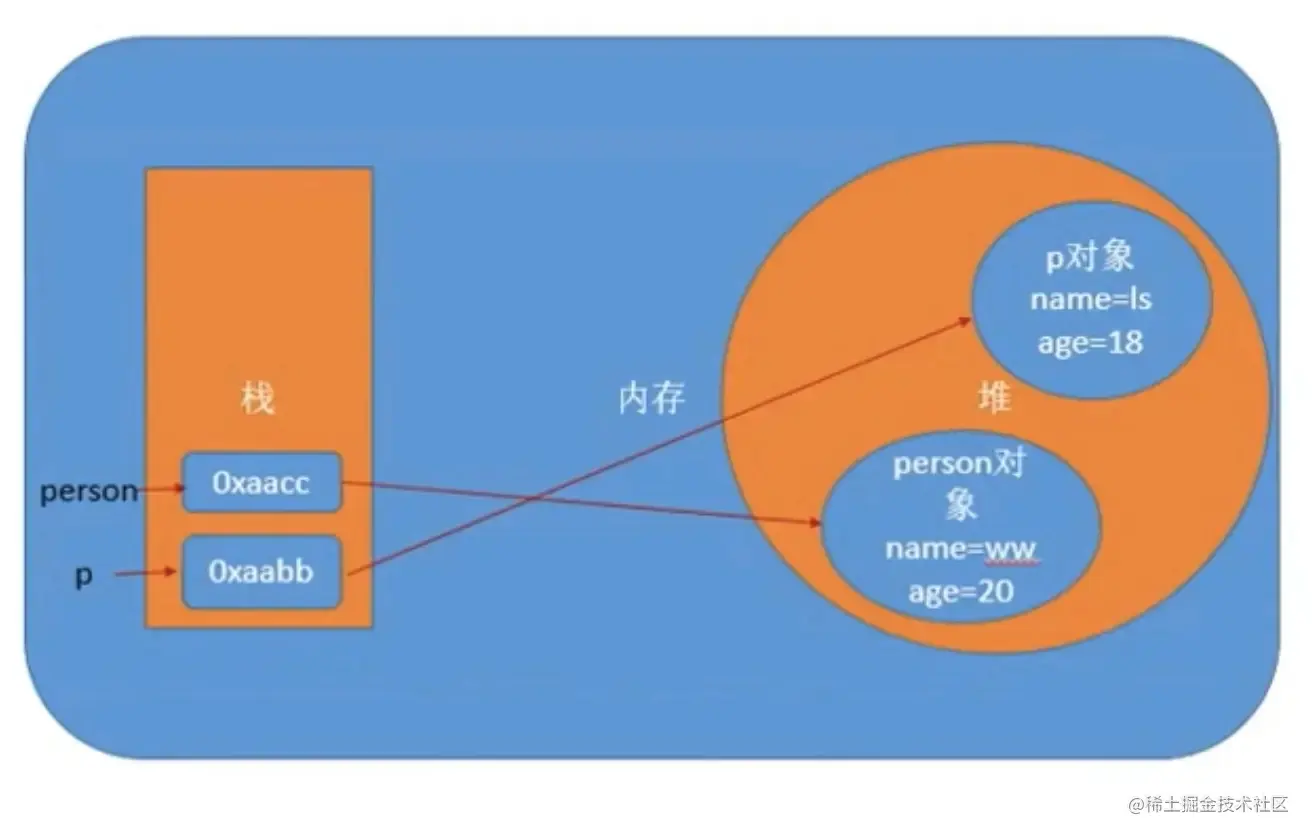 当我们把引用类型变量传给形参时,其实是把变量在栈空间里保存的堆地址复制给了形参,形参和实参其实保存的是同一个堆地址,所以操作的是同一个对象。