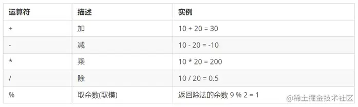 运算符(operator)也被称为操作符,是用于实现赋值、比较和执行算数运算等功能的符号。