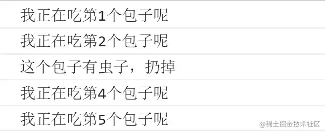 例如,吃5个包子,第3个有虫子,就扔掉第3个,继续吃第4个第5个包子,其代码实现如下: