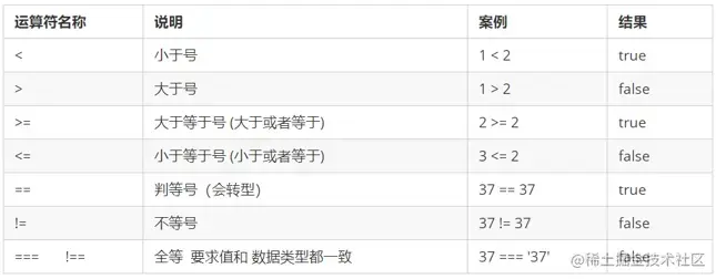 比较运算符(关系运算符)是两个数据进行比较时所使用的运算符,比较运算后,会返回一个布尔值(true / false)作为比较运算的结果。