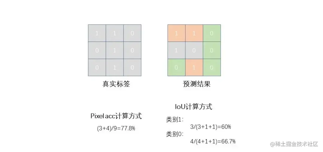 像素准确度(Pixel accuracy):像素准确度是指模型正确预测的像素占总像素数的比例。但它并不能区分不同类别的预测结果。