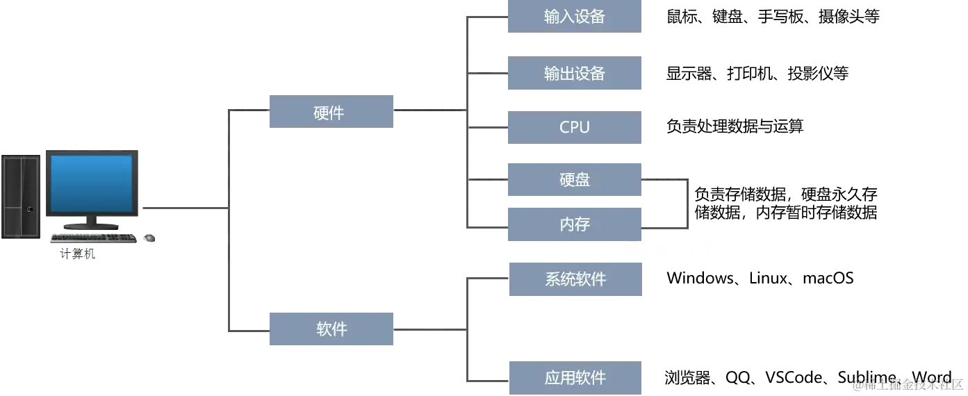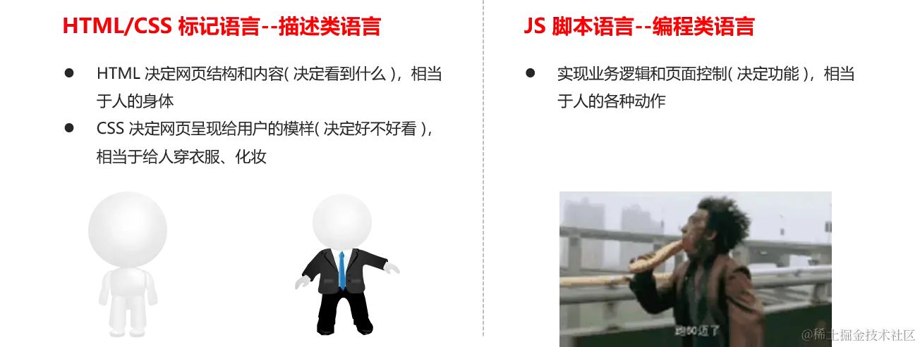 | 标记语言 | 标记语言(HTML、CSS)不用于向计算机发出指令,常用于格式化和链接。标记语言的存在是用来被读取的,他是被动的。 |