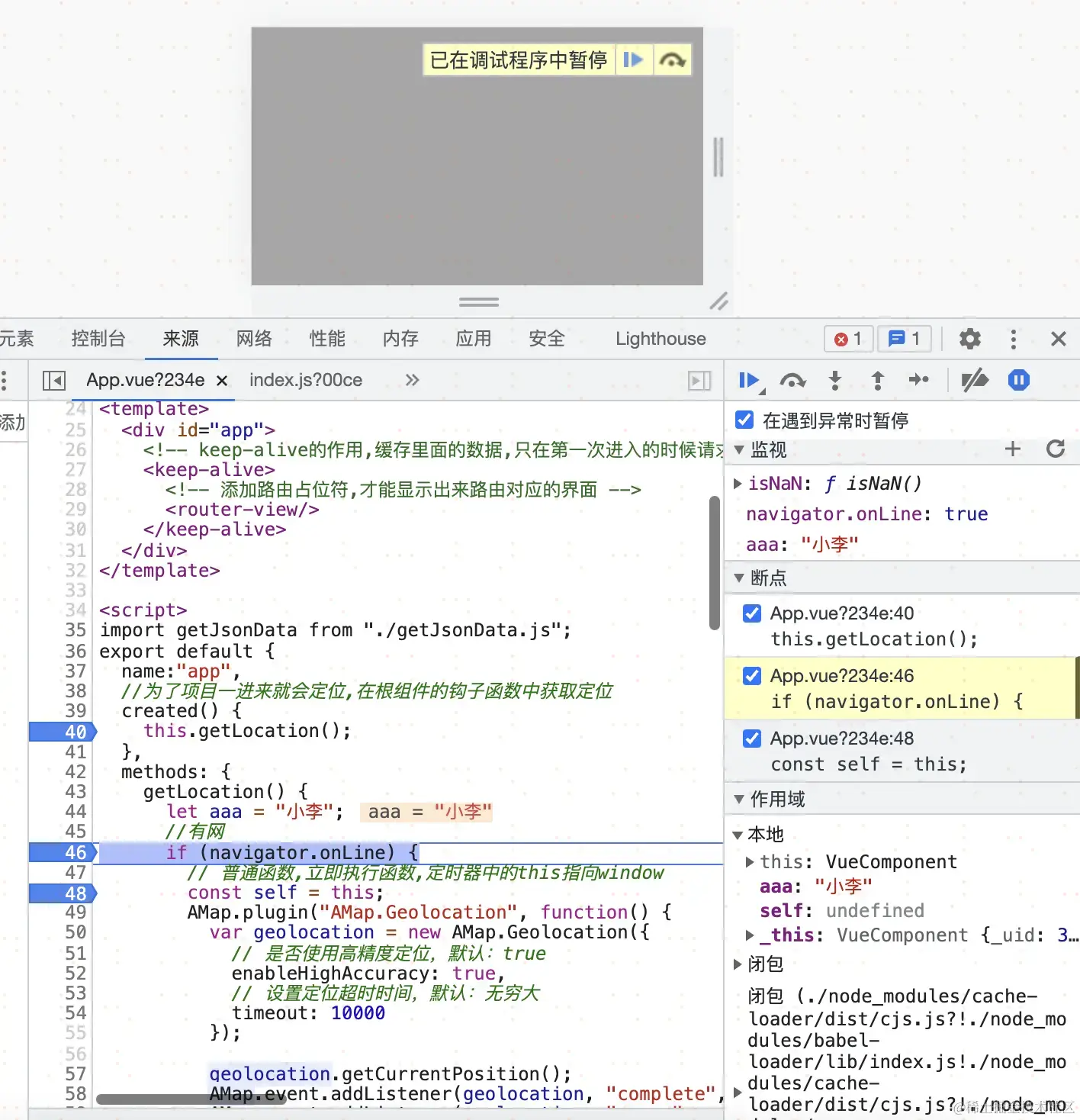 调试步骤:浏览器中按 F12 --> sources --> 找到需要调试的文件 --> 在程序的某一行设置断点