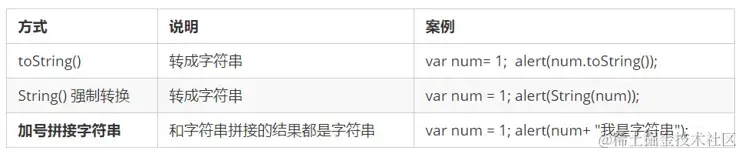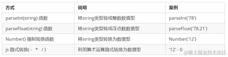 使用表单、prompt 获取过来的数据默认是字符串类型的,此时就不能直接简单的进行加法运算,而需要转换变量的数据类型。通俗来说,就是把一种数据类型的变量转换成另一种数据类型,通常会实现如下三种方式的转换:
