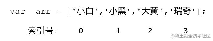 var 数组名 = ['小白','小黑','大黄','瑞奇'];