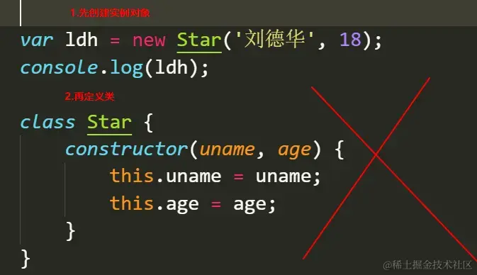 - 在 ES6 中类没有变量提升,所以必须先定义类,才能通过类实例化对象