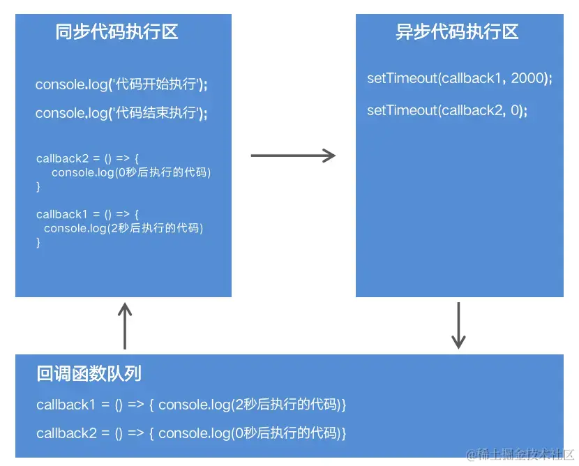 - 当异步代码的回调函数可以执行的时候,就把回调函数放入同步代码执行区,继续执行