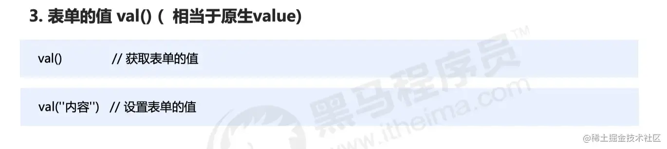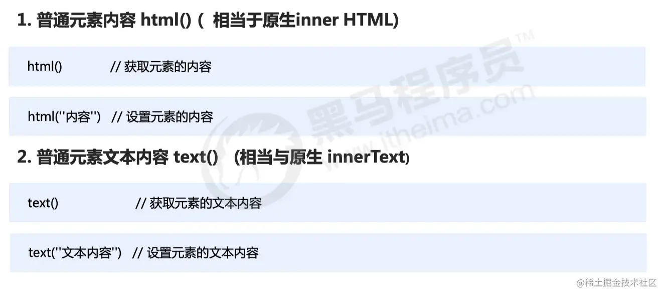 常见操作有三种:html() / text() / val() ; 分别对应JS中的 innerHTML 、innerText 和 value 属性,主要针对元素的内容还有表单的值操作。