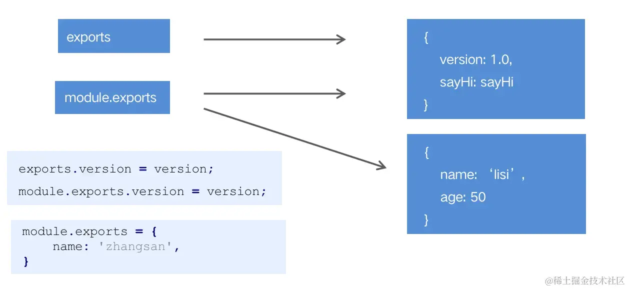 exports是module.exports的别名(地址引用关系),导出对象最终以module.exports为准。