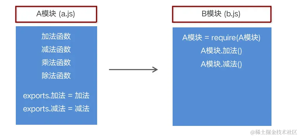 - 模块内部可以使用exports对象进行成员导出,使用require方法导入其他模块。