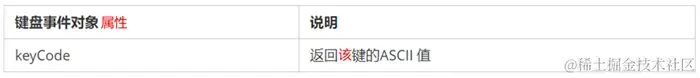 // 键盘事件对象中的keyCode属性可以得到相应键的ASCII码值
