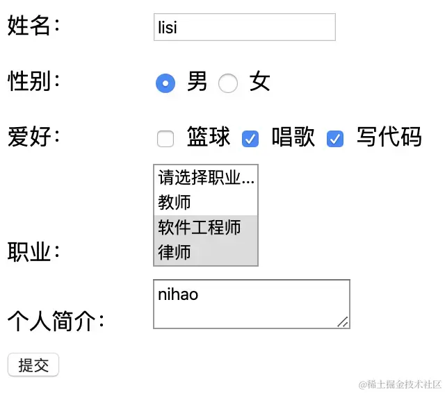 4、 复选框是`checkbox`这种的类型时,data中的hobby我们要定义成数组,否则无法实现多选