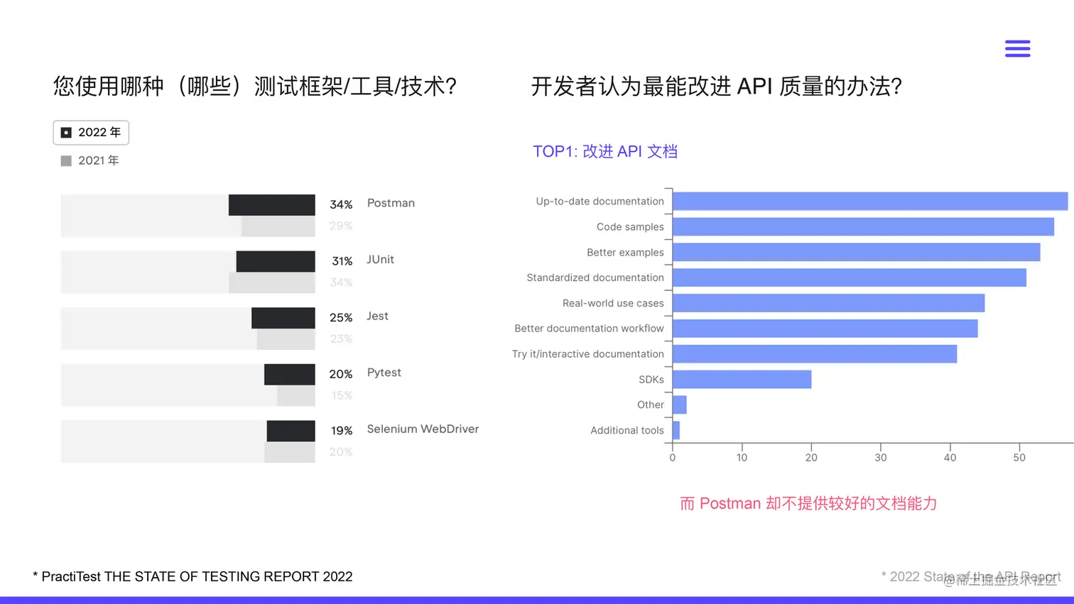 左侧是去年海外开发人员的另外一个数据,测试人员用过最多的框架是 Postman 和 JUnit。Postman 是 API 调试工具,调试也是测试的重要环节。右侧数据是关于“开发者认为改进 API 质量的措施”的调研,排名第一的是“写一个比较好的 API 文档”,认为这个对后面的流程有帮助。这个调研结果反映了 API 现在的设计、定义和测试环节是断层的,是个痛点。
