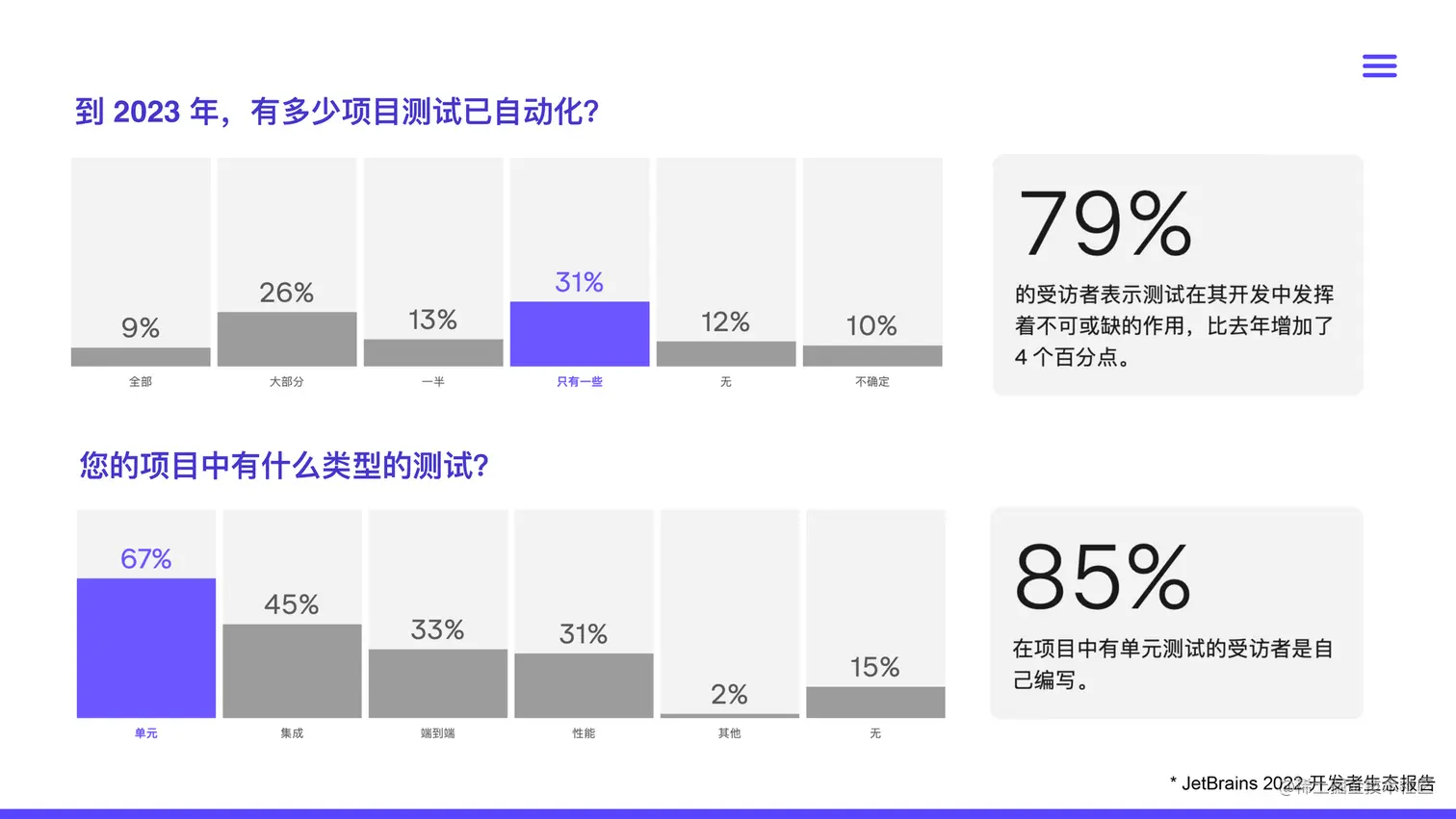 这是 JetBrains 去年的开发者生态报告,可以看到近 50% 的团队觉得自动化测试的覆盖只有一些效果;但 79% 的受访者表示自动化测试非常有用。第二个图是统计项目中的测试类型,绝大多数是单元测试,其他的类型相对比较少,且辅助数据显示,85% 的单元测试开发者自己写的。