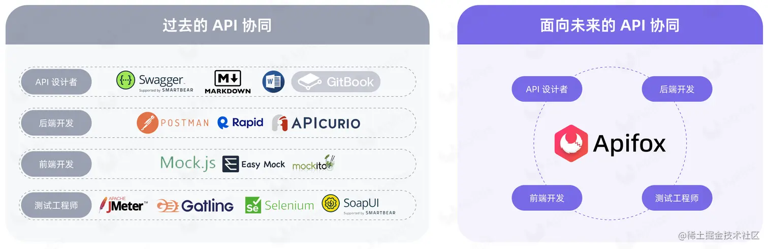 最早的时候,Apifox 与 Postman 有些类似,是一个调试工具,但是现在 Apifox 的产品形态已经发生了改变,是一个 API First 的原生实践,一站式覆盖 API 设计、开发和测试。Apifox 的核心就是解决了目前市面上没有解决的问题——实现多种角色 API 设计者、开发者、测试者在一套工具和数据上去进行协同,尤其是前面说到的 API 定义部分。