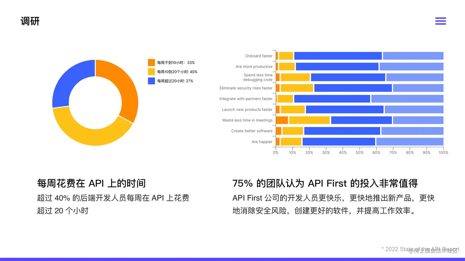 这两个调研结果显示 40% 以上的后端开发人员每周超过 20 个小时的时间在 API 的开发活动上,有 75%的团队认为 API First 的投入是非常值得,可以让他们工作更开心,避免无效沟通浪费时间,提高开发质量。
