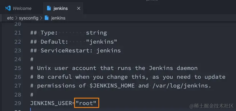 我们后面会访问centos中的某些文件夹,默认Jenkins使用的用户是 jenkins,可能会没有访问权限,所以我们需要修改一下它的用户: