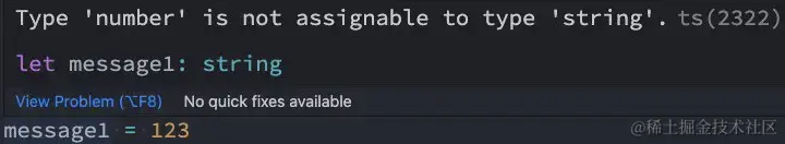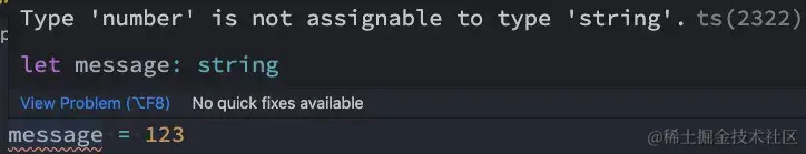 这是因为在一个变量第一次赋值时,会根据后面的赋值内容的类型,来推断出变量的类型。上面的message就是因为后面赋值的是一个string类型,所以message虽然没有明确的说明,但是依然是一个string类型。