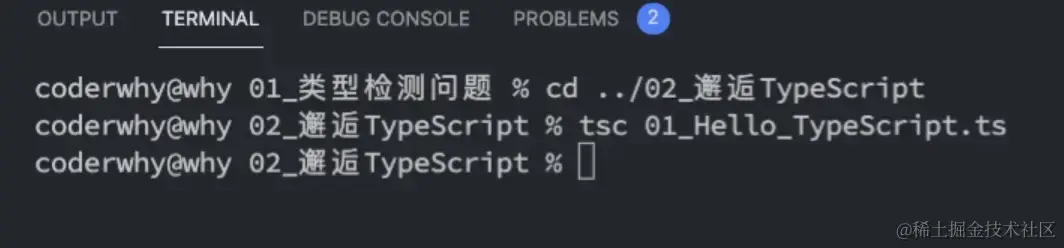 先cd到ts文件目录,然后使用tsc命令,即可在同位置将ts代码转成js代码。