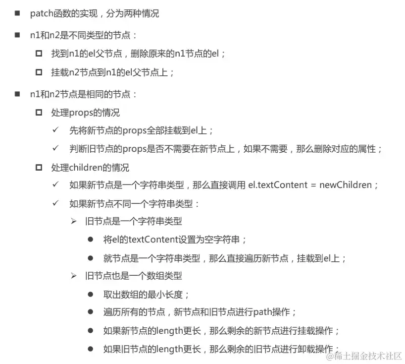 - 第三步:处理子节点,如果是字符串节点,那么直接设置textContent,如果是数组节点,那么遍历调用 mount 函数。