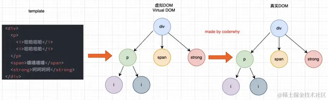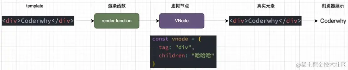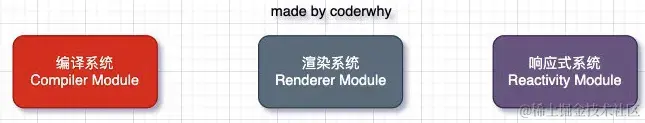 - 渲染模块(runtime):又称Renderer模块,真正负责渲染的模块,主要职责是将虚拟节点渲染成真实元素,然后显示到浏览器上。