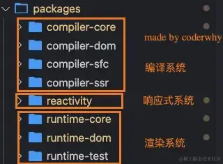- 响应式模块(reactivity):主要职责是监听响应式的数据,然后通过diff算法判断VNode是否有变化,如果有变化,会通知渲染系统重新渲染元素,然后展示。