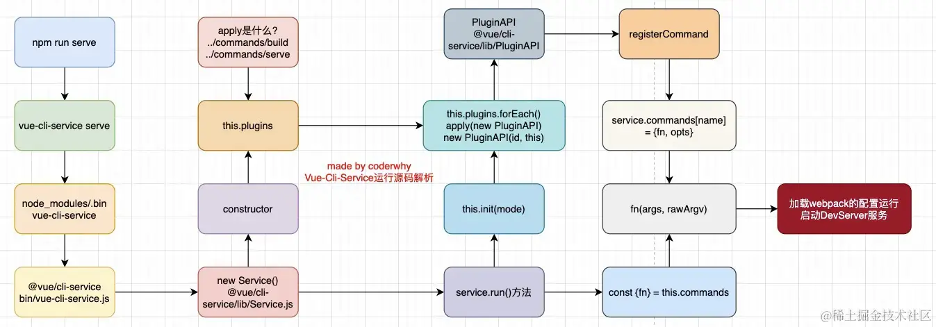 同理,当我们使用脚手架,执行npm run serve,也会从node_modules/.bin里面执行vue-cli-service命令,然后具体流程如下: