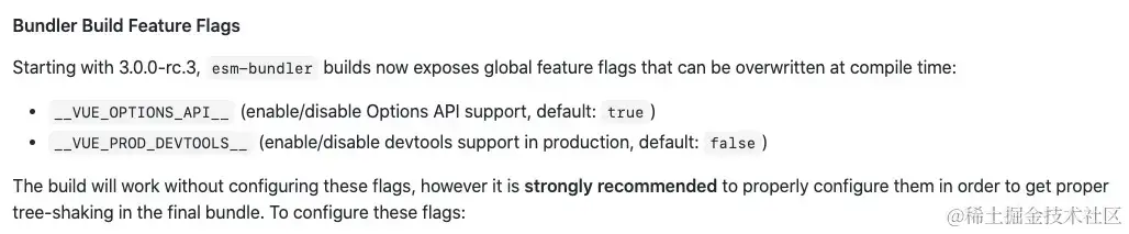 - 一个是是否支持使用Vue2的OptionsAPI,默认是true。如果设置成false,那么就会把这些代码从源代码里面删除,这样我们的代码体积就会小一点。