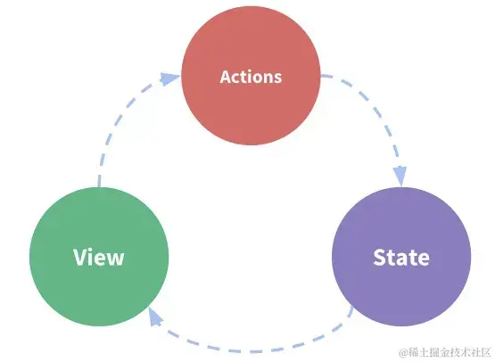 因此,我们是否可以考虑将组件的内部状态抽离出来,以一个全局单例的方式来管理呢? 在这种模式下,我们的组件树构成了一个巨大的 “视图View”,不管在树的哪个位置,任何组件都能获取状态或者触发行为,通过定义和隔离状态管理中的各个概念,并通过强制性的规则来维护视图和状态间的独立性,我们的代码边会变得更加结构化和易于维护、跟踪。