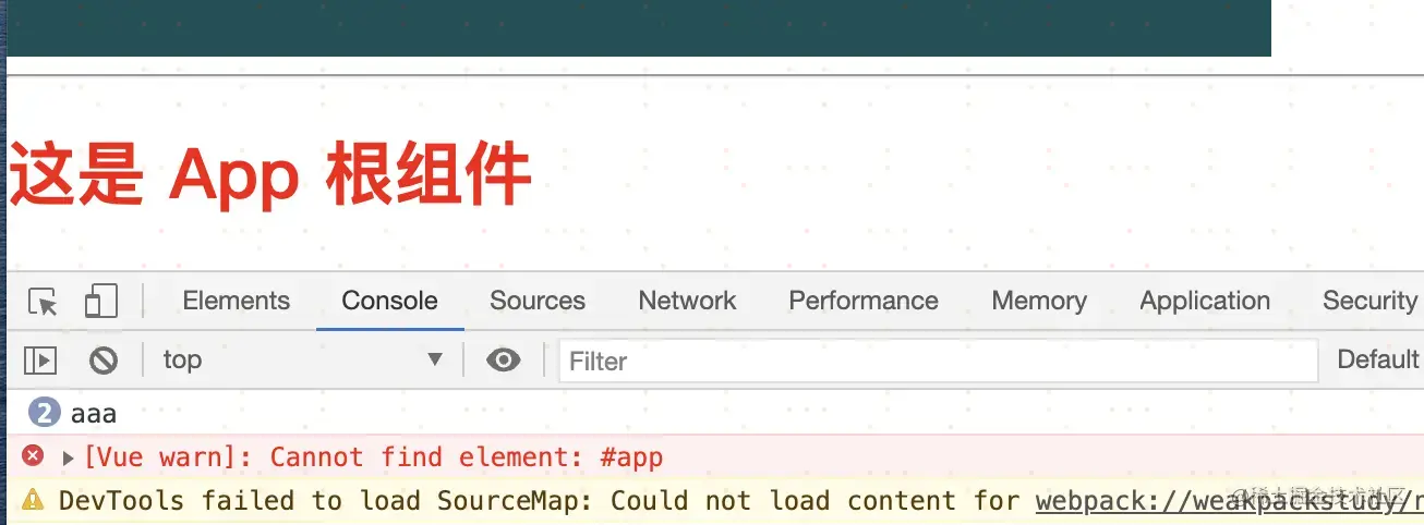 疑问: 这里项目运行成功之后,报错:[Vue warn]: Cannot find element: #app,但是实际 #app 这个 div 可以正常显示,不知道为什么报错,如下图: